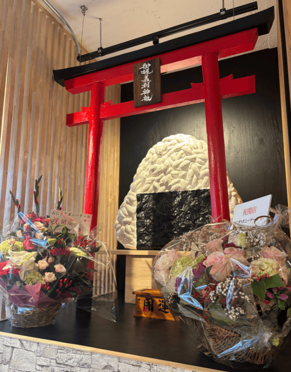 この2階エリアには当店名物の知る人ぞ知るパワースポット「御握義利神社」もあります。”御握義利神社の筆字”はガチの神社の字の依頼を受けている職人さんに書いて頂いたものです。ご縁・繁栄・実りを結ぶようにと願いを込めて「大きなおむすび(おにぎり)」を職人様に作って頂きました。お越しの際は是非このおおきなおむすびの前で心を一度リセットし、そっと願いを込めてみてください。