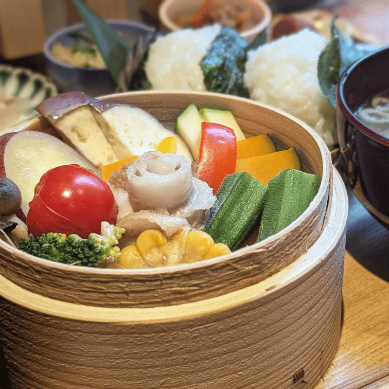 おにぎりポニーテール限定御膳の「おにぎりせいろ蒸し御膳」は彩とりどりな見た目なのでSNS映えとしても充実しています◎